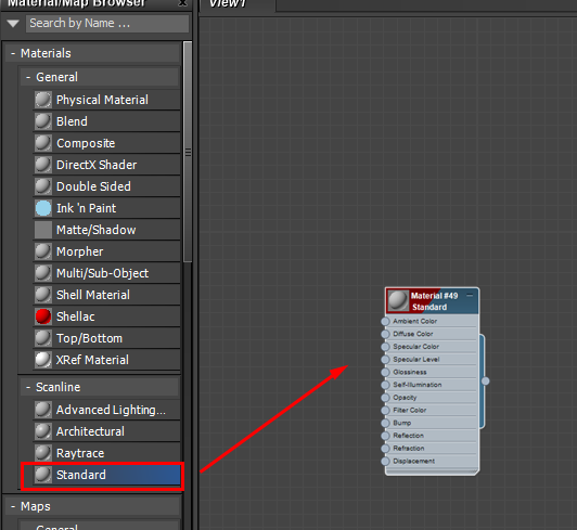 Standard 메터리얼을 선택하여 드래그해서 view 화면에 나타나게 합니다