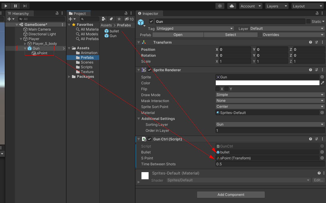 수정된 GunCtrl 스크립트에 프리팹으로 만들었던 bullet과 Gun 오브젝트의 자식으로 있는 sPoint를 GunCtrl스크립트에 연결합니다