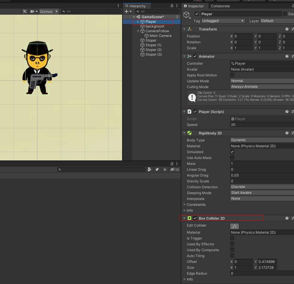 Player 오브젝트에 BoxCollider2D 를 붙입니다