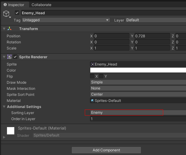 Enemy의 각각의 관절에 Sorting Layer -> Enemy 를 만들고 그림이 위아래가 바뀌지 않도록 합니다