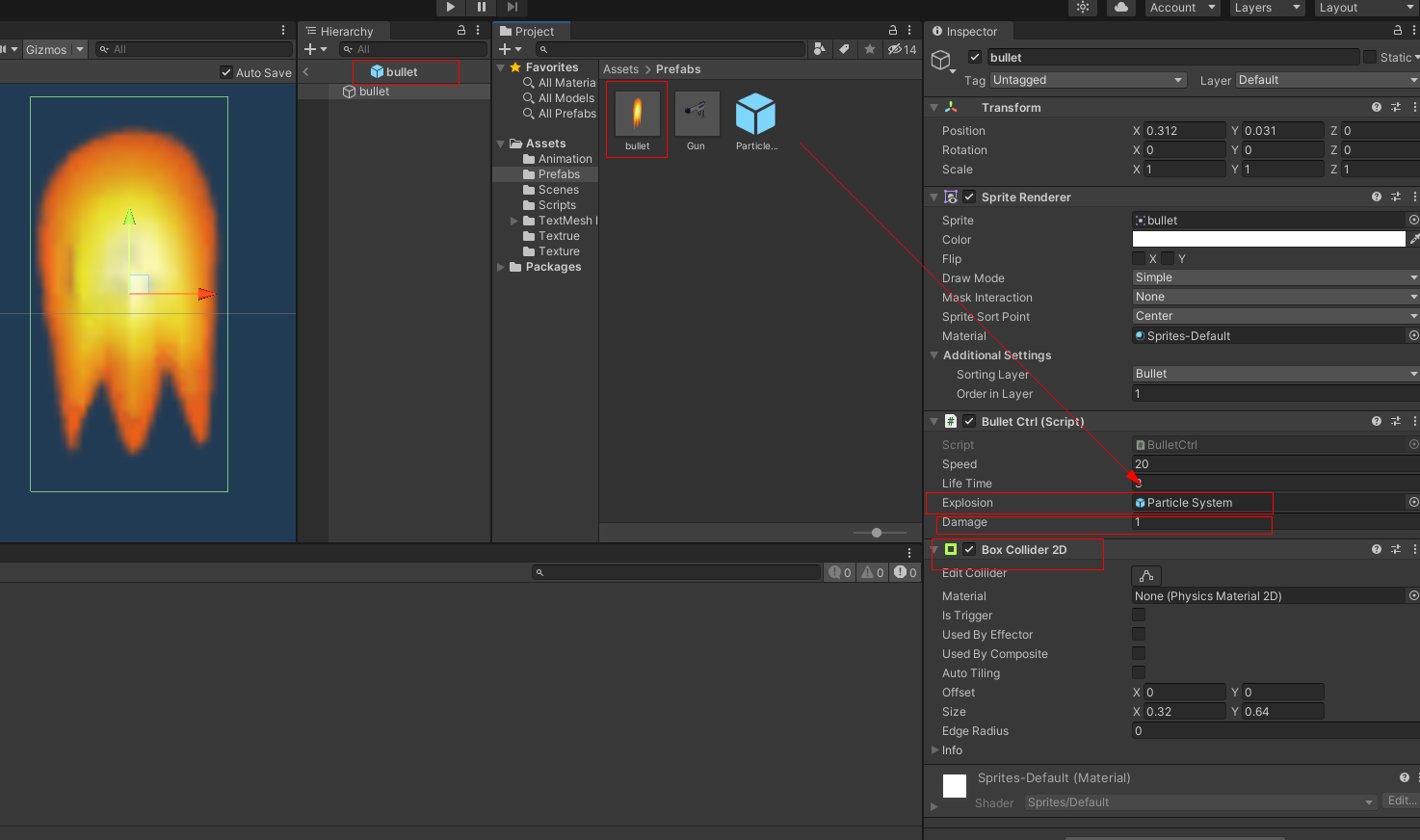 bulletCtrl 스크립트를 수정하고 Explosion -> Particle System speed 20 , LifeTime 3 , Damage1을 넣습니다