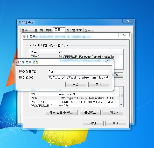 제일 앞단에 추가합니다 %JAVA_HOME%\bin;