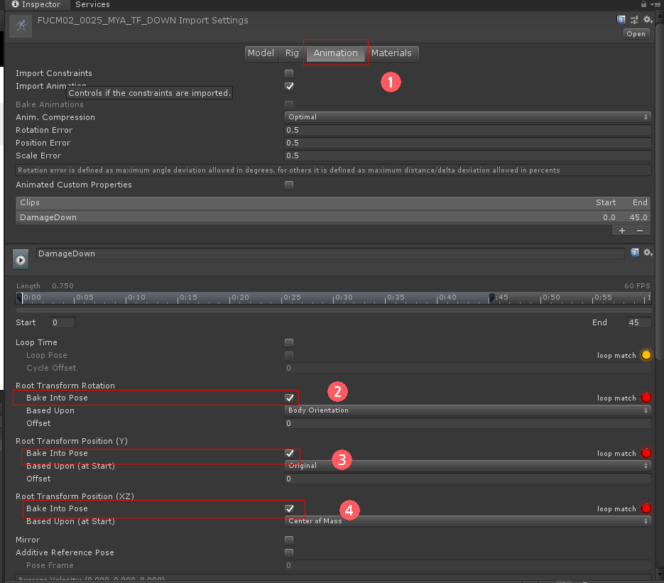 그리고 Animation으로 들어가서 Bake into Pose를 체크합니다