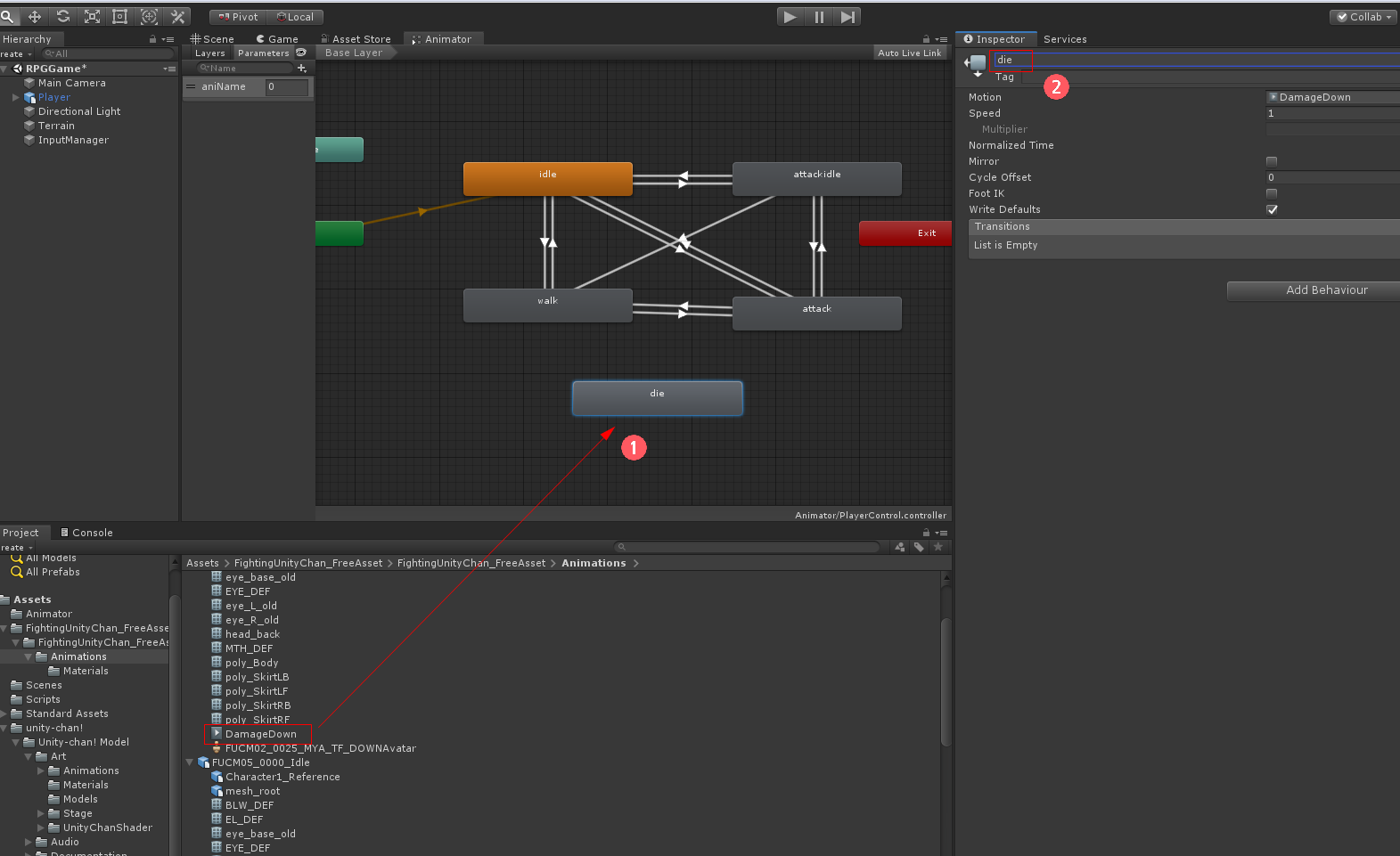 Assets/FightingUnityChan_FreeAsset/FightingUnityChan_FreeAsset/Animations/FUCM02_0025_MYA_TF_DOWN에서 DamageDown을 드래그해서 Animator에 놓고 이름을 die 한다