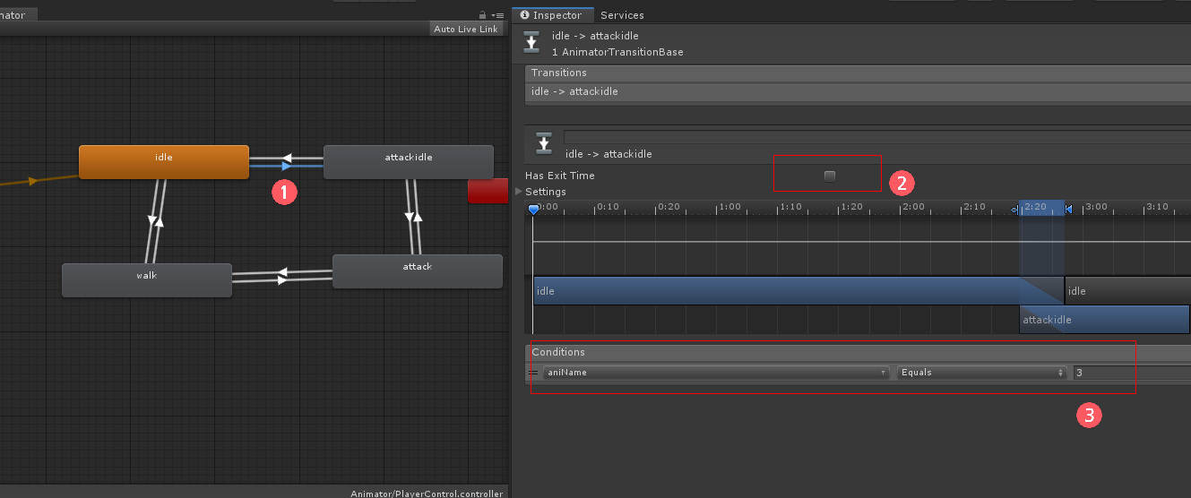 walk <- attackidle 사이에 Make Transition을 연결하고 화살표를 선택하여 Has Exit Time을 체크 해제하고