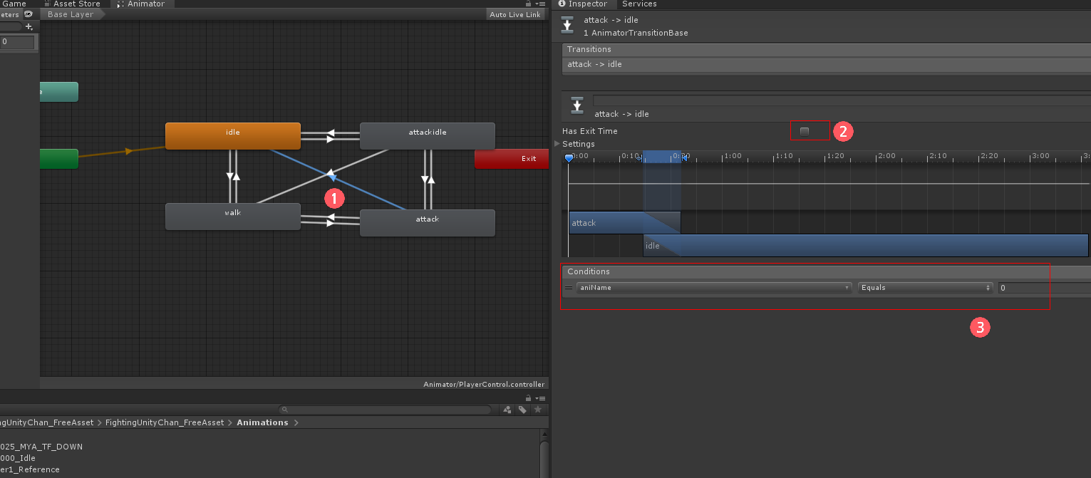 attackidle <- attack 사이에 Make Transition을 연결하고 화살표를 선택하여 Has Exit Time을 체크 해제하지 말고