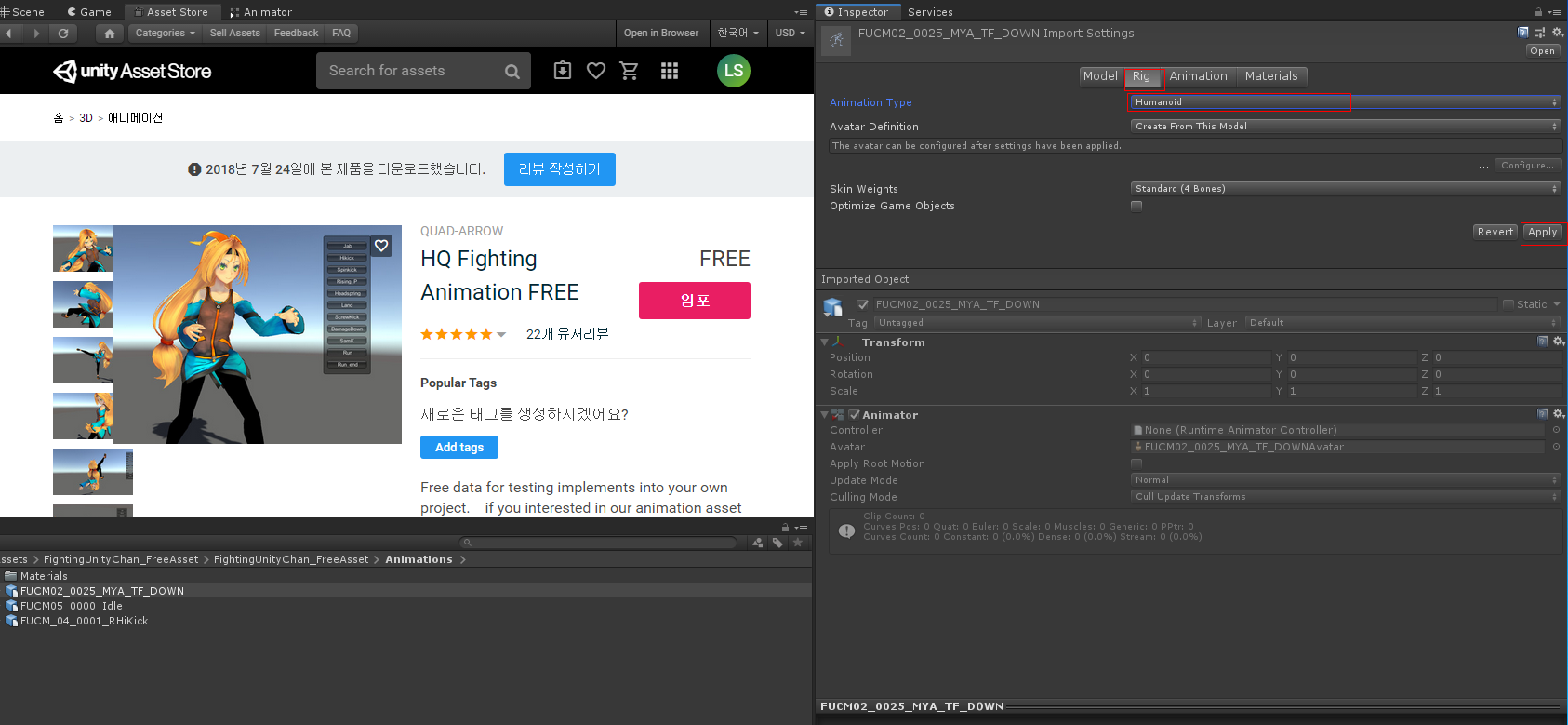 그리고 Asset Store에 들어가서 찾기 에서 HQ Fighting Animation을 찾아 임포트 합니다