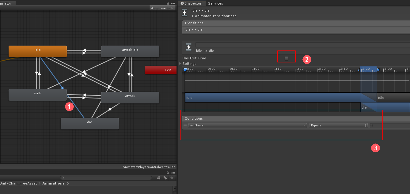 die <- attackidle 사이에 Make Transition을 연결하고 화살표를 선택하여 Has Exit Time을 체크 해제하고