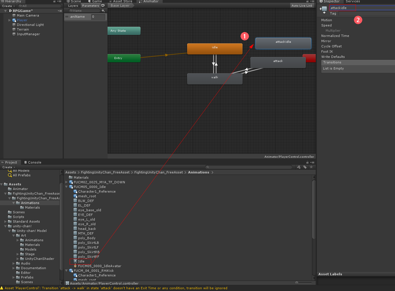 Assets/FightingUnityChan_FreeAsset/FightingUnityChan_FreeAsset/Animations/FUCM05_0000_Idle에서 Idle을 선택하여 Animator에 드래그하고 이름을 attackidle로 바꿉니다