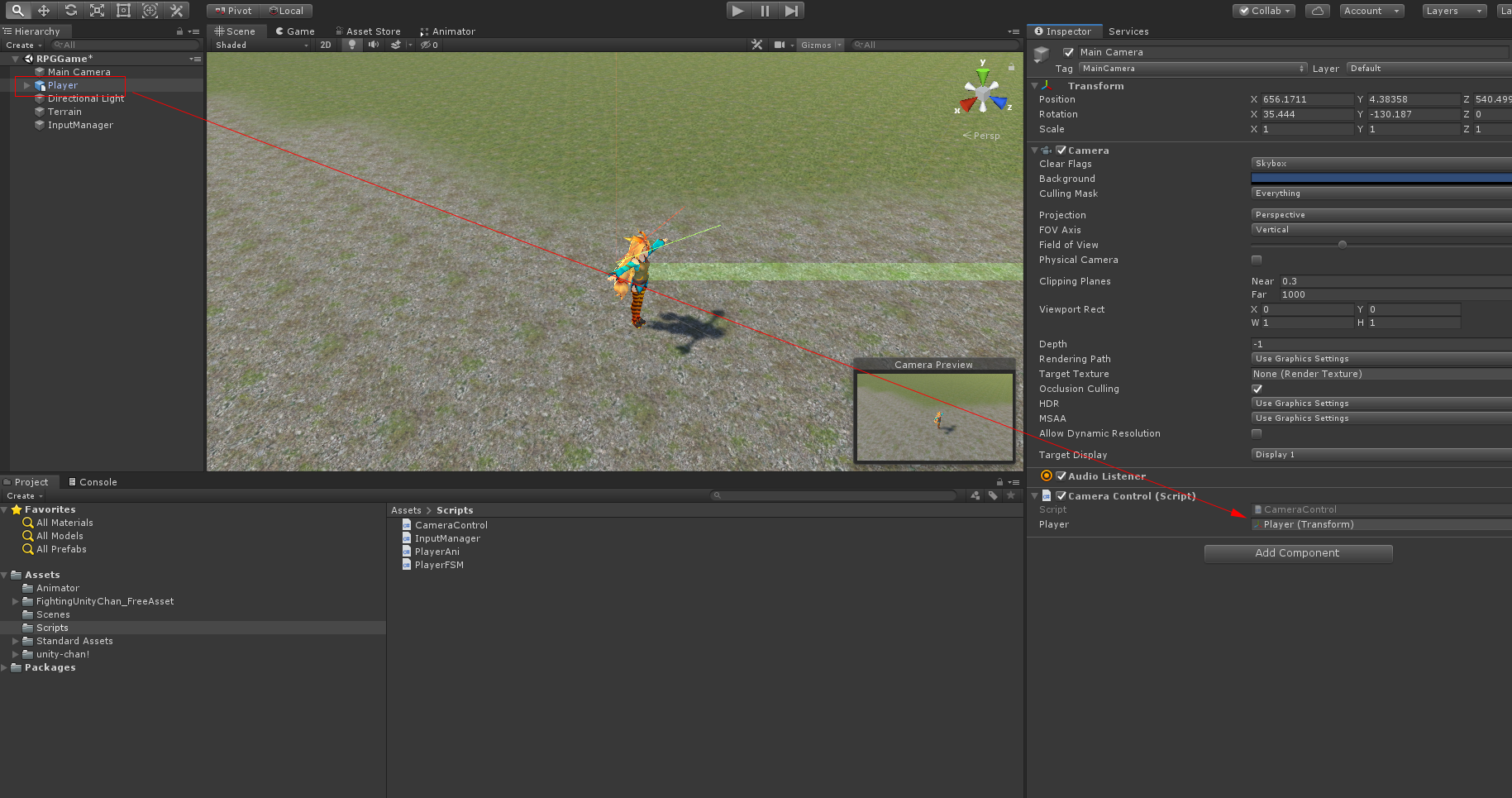 CameraControl 스크립트 작성하고 Player 오브젝트를 드래그하여 inspector 변수에 넣습니다