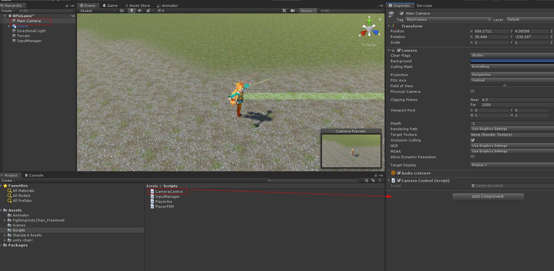 CameraControl 스크립트를 새로 만들고 CameraControl 스크립트를 Main Camera에 붙입니다
