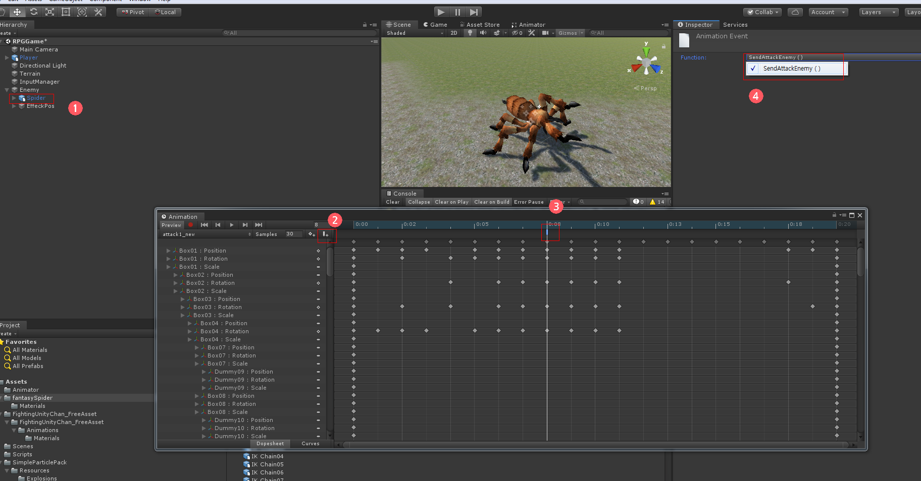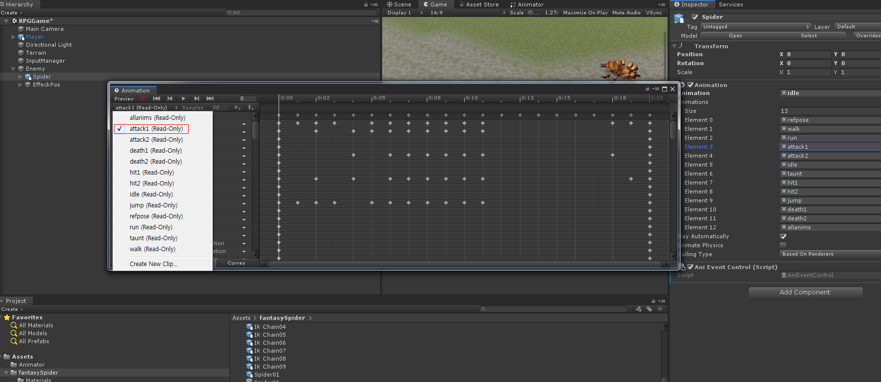 그리고 Spider 오브젝트를 선택하고 Window ->Animation ->Animation 을 열고 attack1_new 애니메이션에 공격 타이밍에 Add event 를 누른 다음 Function 을 SendAttackEnemy() 함수를 등록합니다