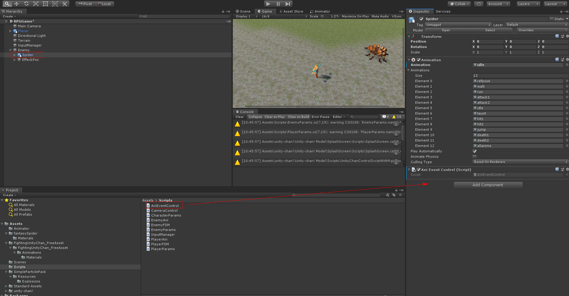 먼저 AniEventControl 스크립트를 만들고 Enemy 오브젝트에 자식으로 되어있는 Spider 오브젝트에 스크립트를 붙힘니다
