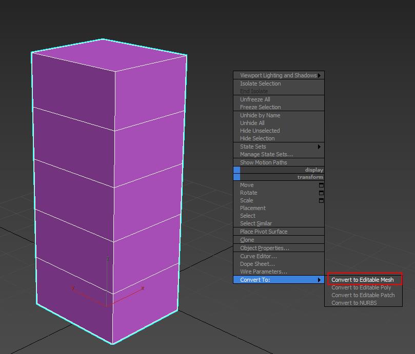 먼저 대략 Height Segs 가 5정도 되는 박스 오브젝트를 만들고 오른쪽 마우스를 클릭하여 Convert To -> Convert to Editable Mesh를 클릭합니다