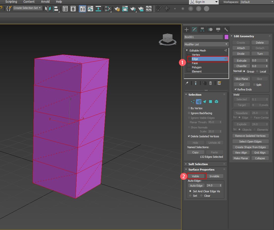 Editable Mesh 에서 Edge를 클릭한 다음 박스 오브젝트의 전체 Edge를 클릭합니다 그리고 visble를 클릭하여 전체 Edge 가 보이도록 합니다