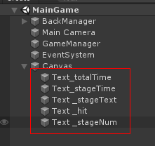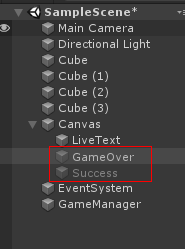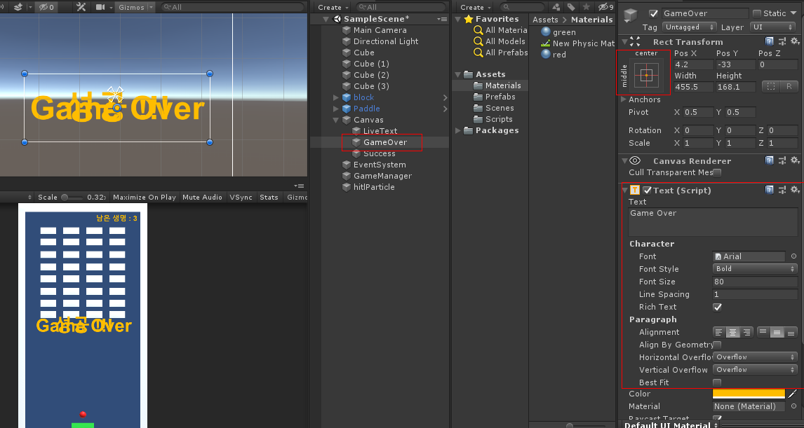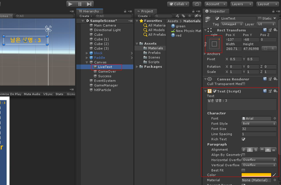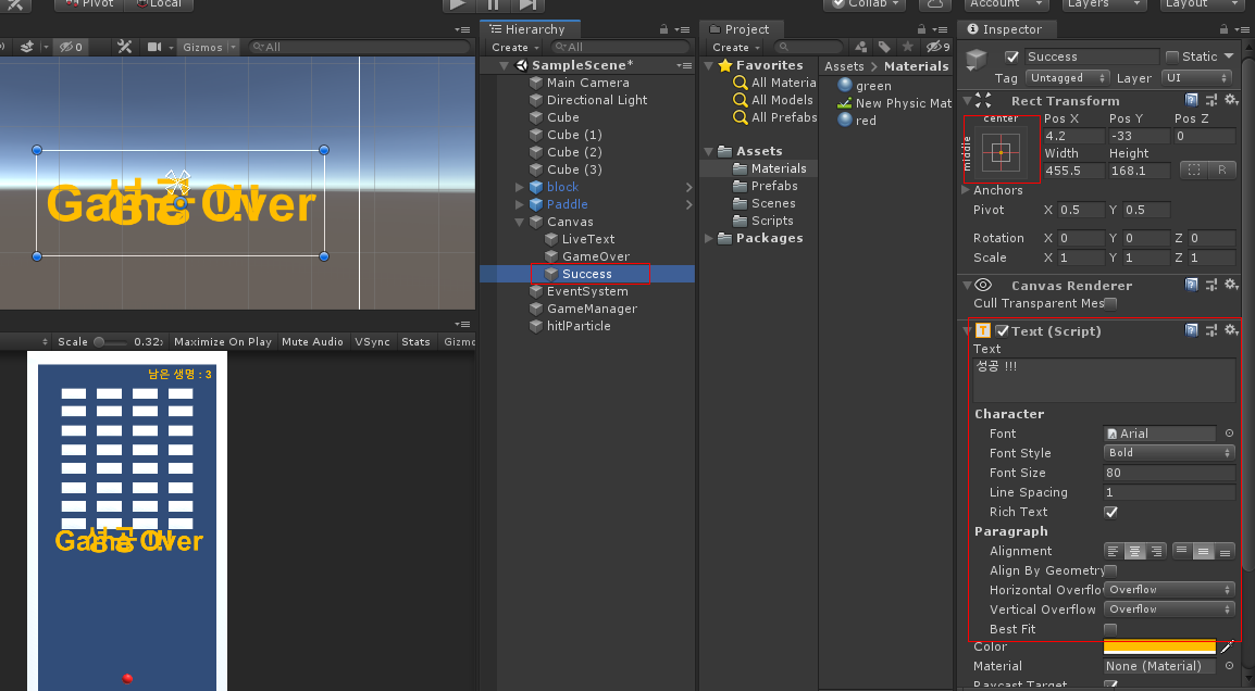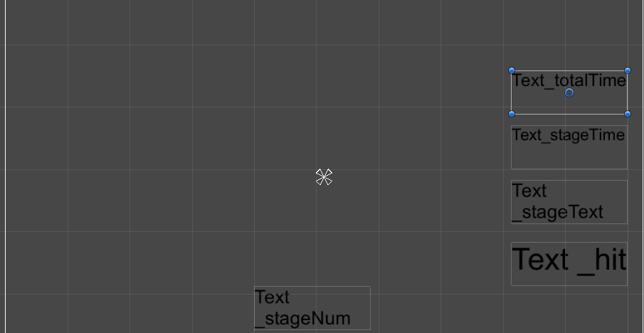 3개를 만들어서 하나는 이름을 LiveText 하고 화면 오른쪽 위에 놓고 나머지 두 개는 GameOver, Success 라 하고 중앙에 놓습니다