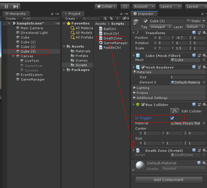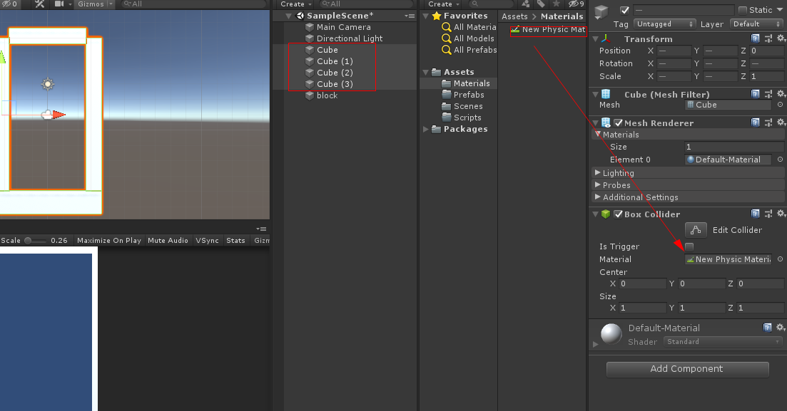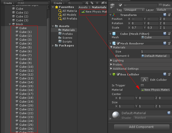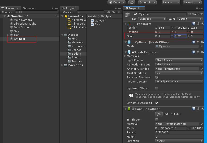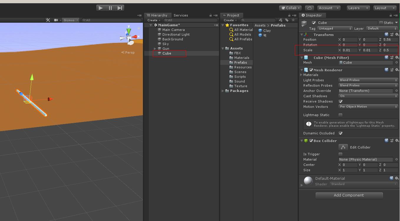 하이라키 뷰에 Cube 오브젝트를 생성하여 스케일을 1, 0.02, 1을 맞춥니다