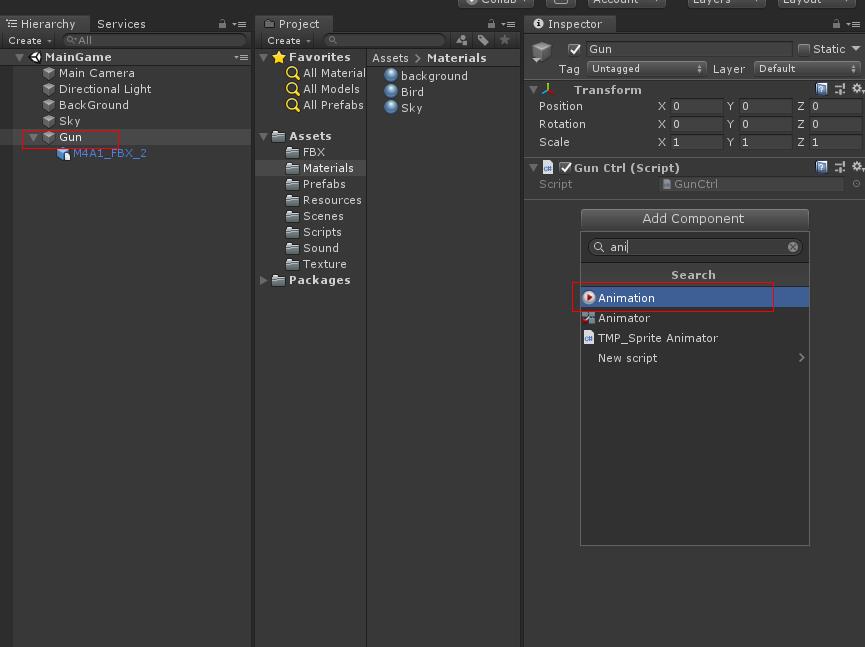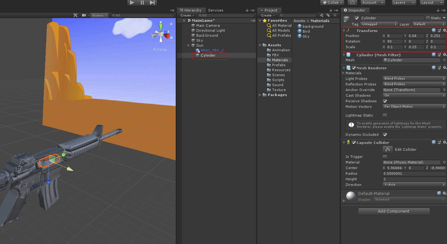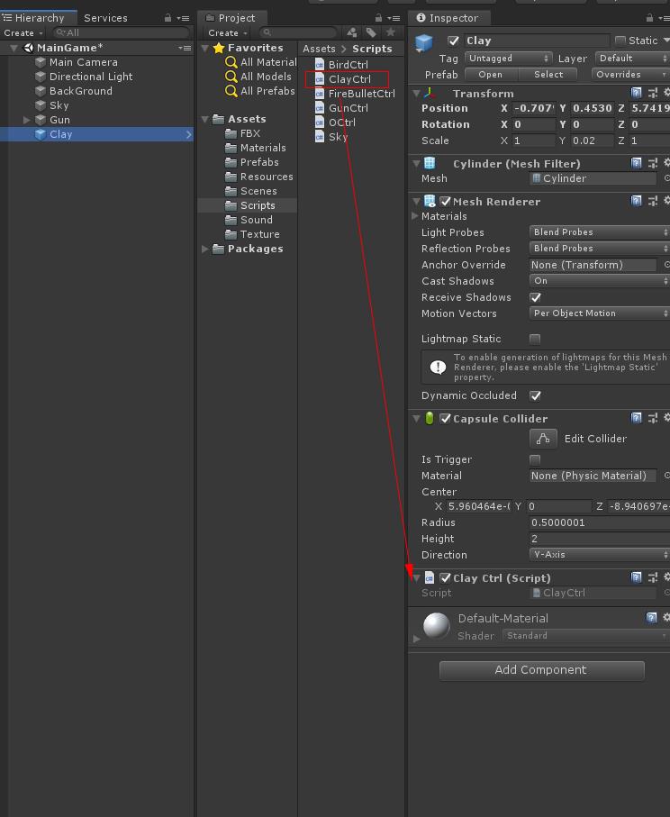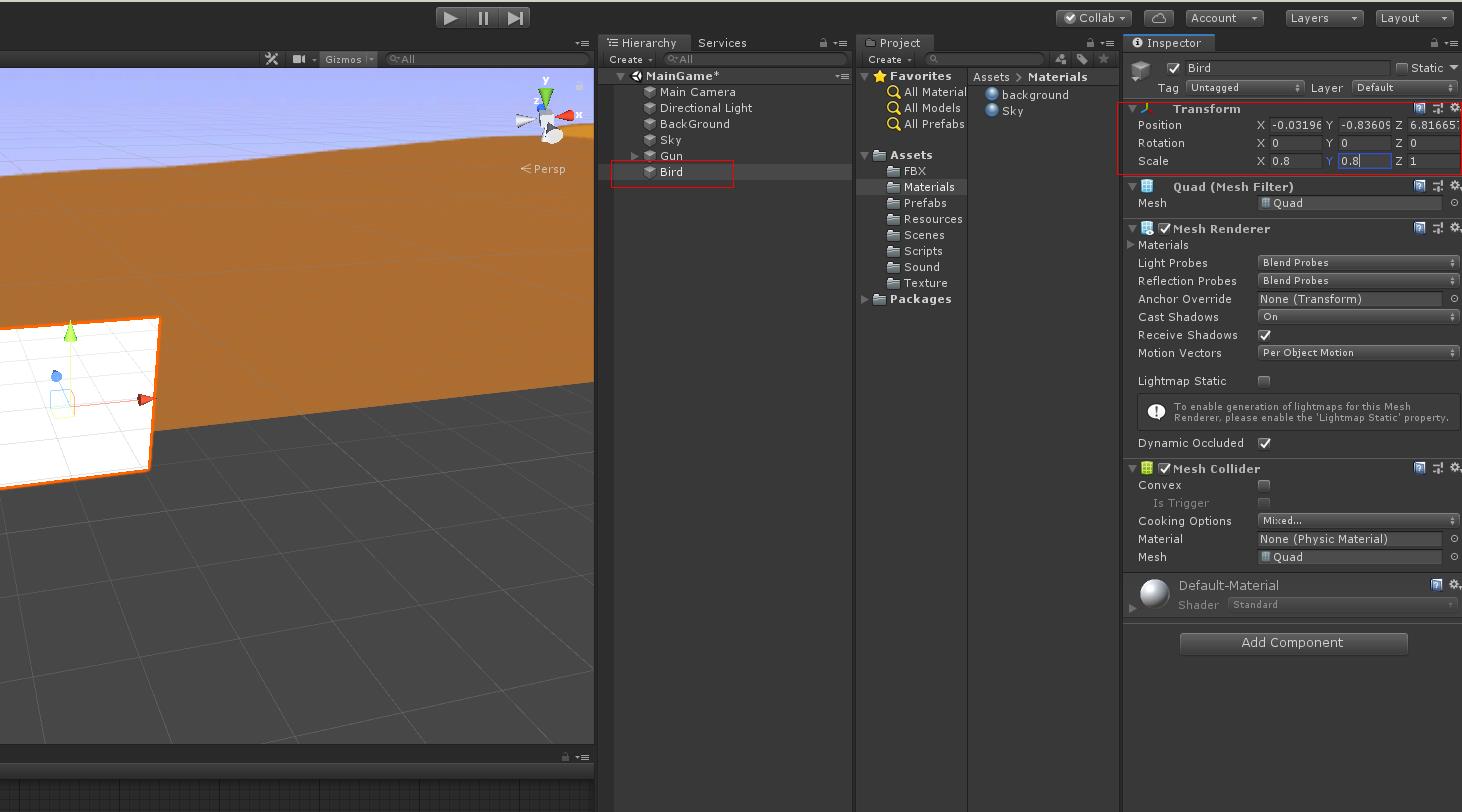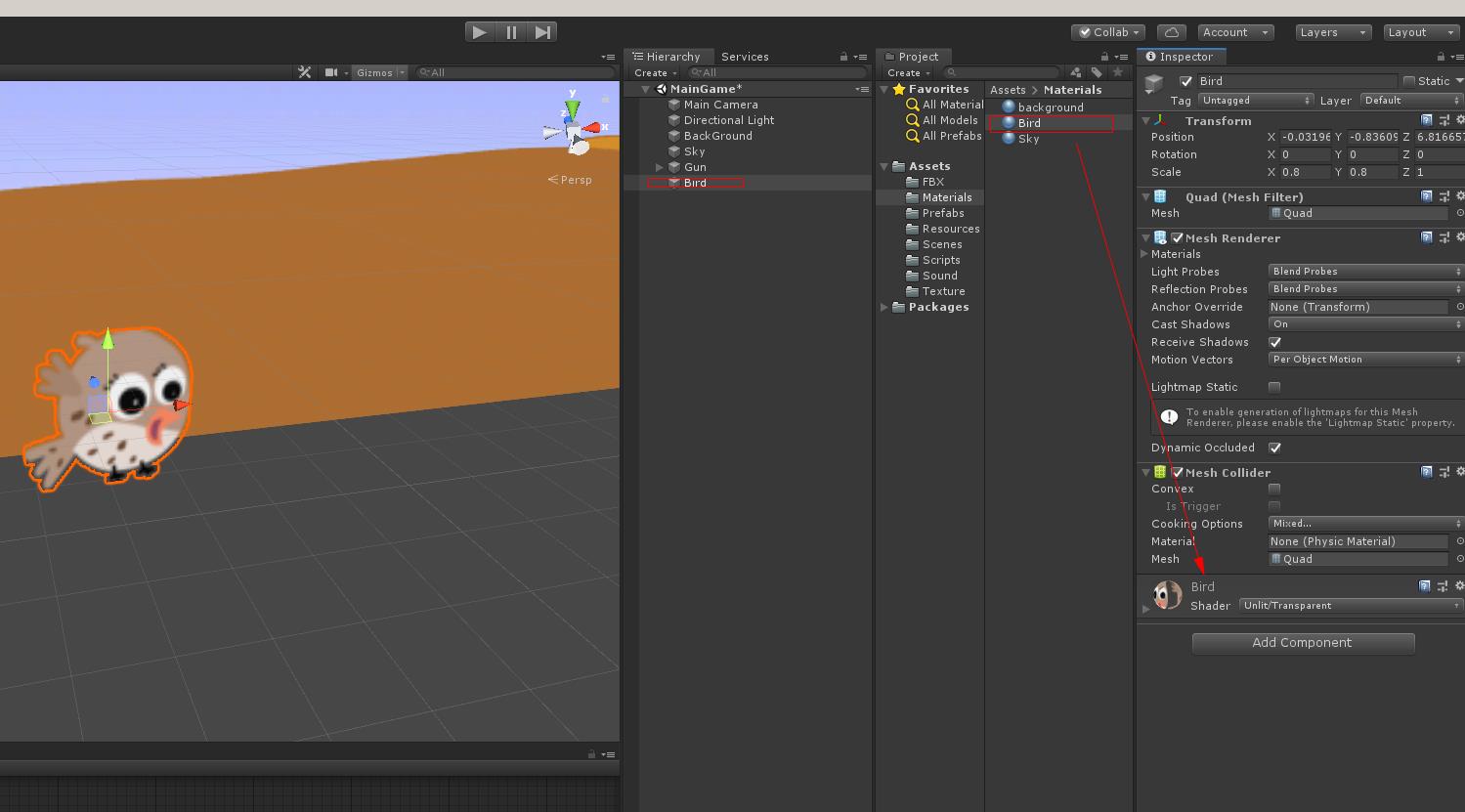 Materials파일에 있는 Bird 메터리얼을 Bird 오브젝트에 드래그하여 붙입니다
