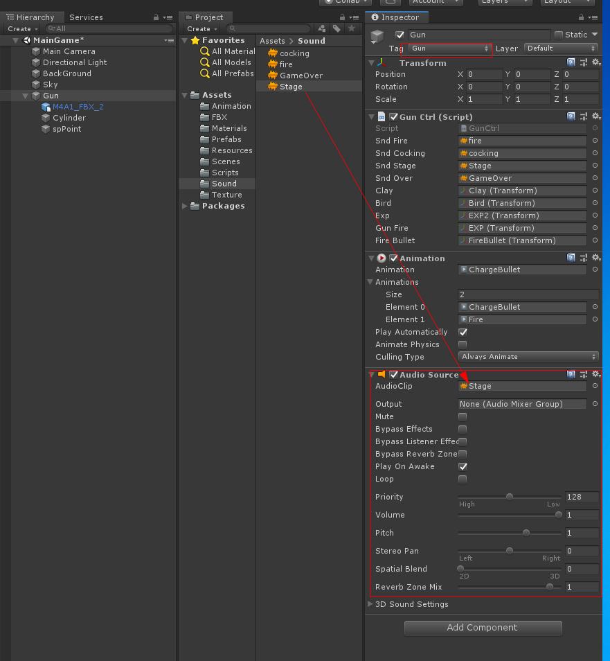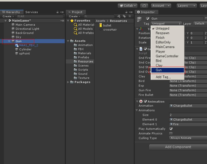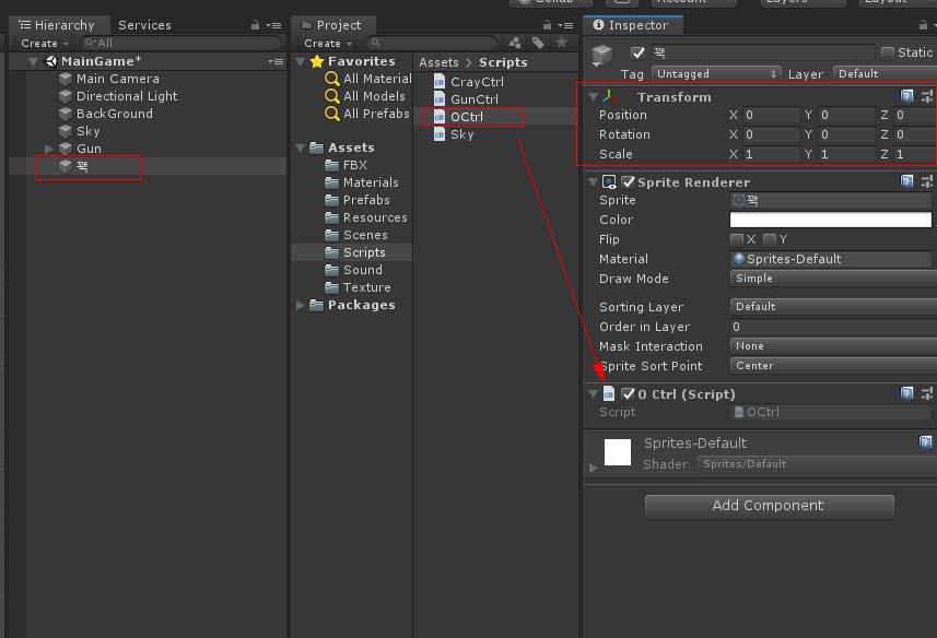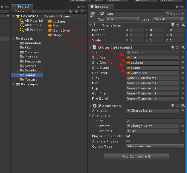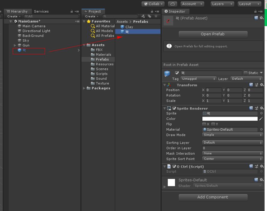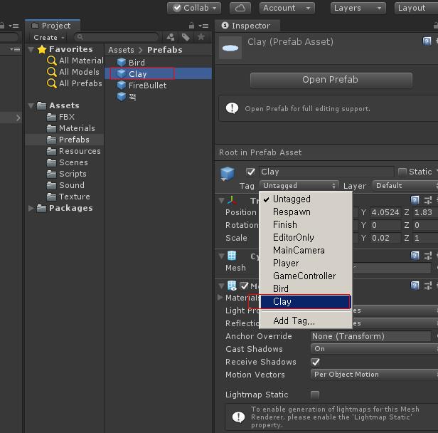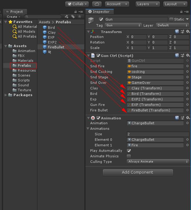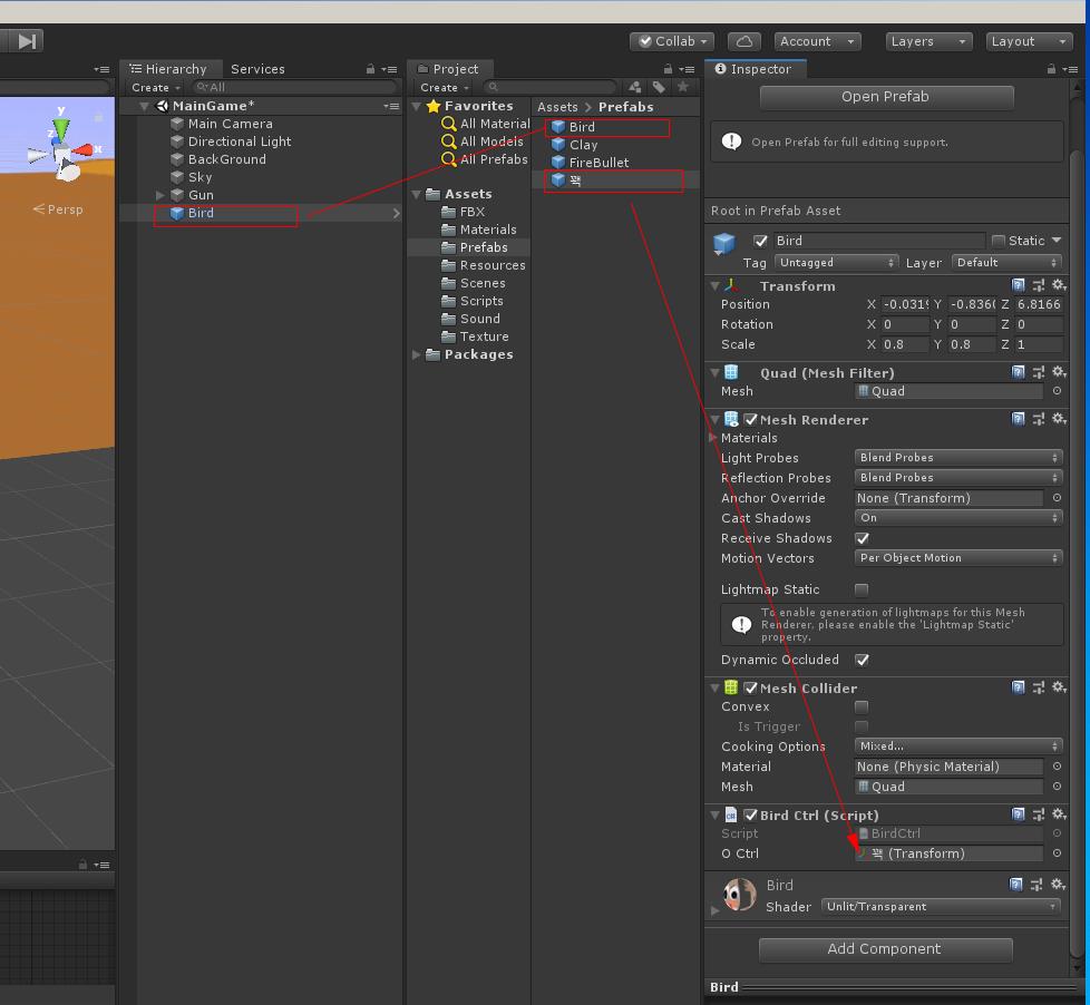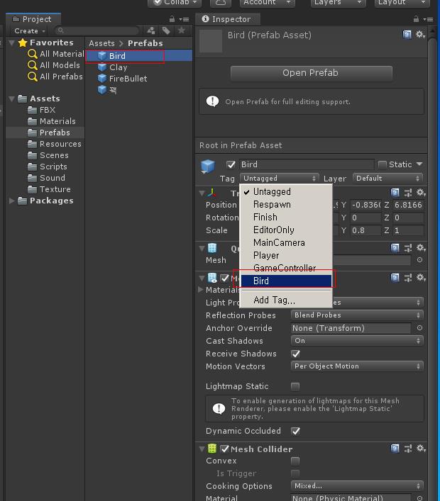 Bird 오브젝트를 Prefabs폴더에 드래그하여 프리 팹을 만들고 Bird 프리팹을 선택하여 O Ctrl 자리에 꽥 프리팹을 연결합니다