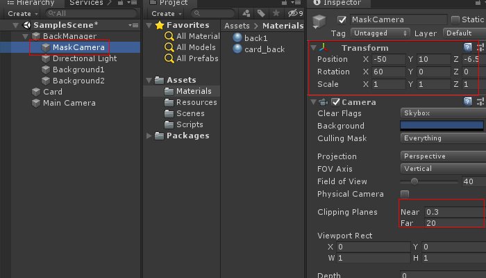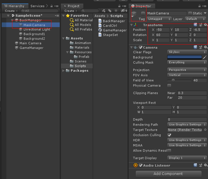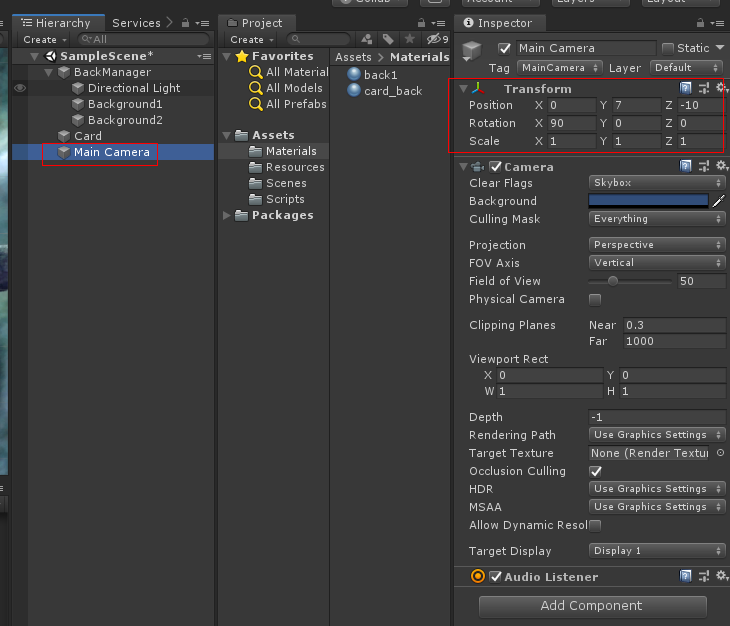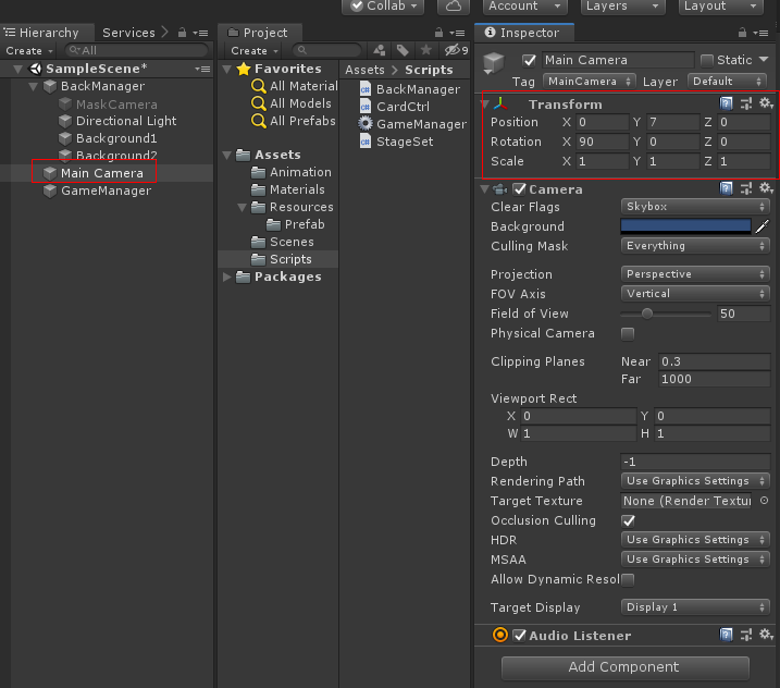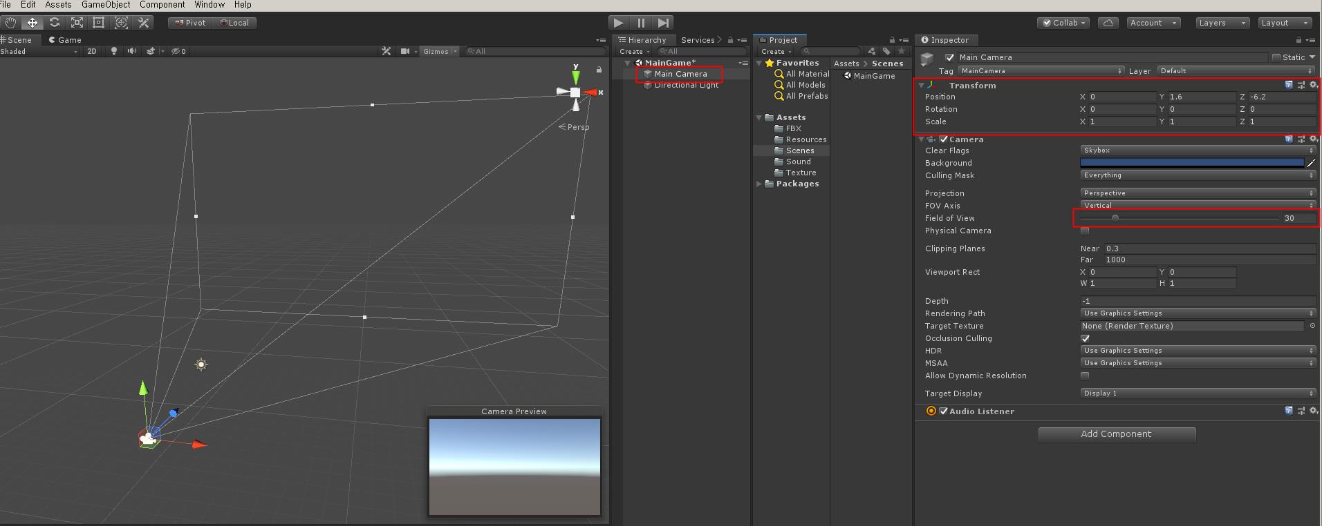 하이 라키 신에서 Main Camera를 선택하여 아래 그림과 같이 Transform Position 값을 0, 1.6 , -6.2로 바꾸고 카메라의 각도 Field of View를 30으로 바꿉니다