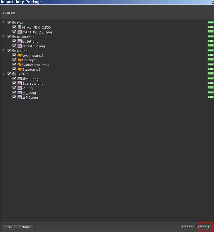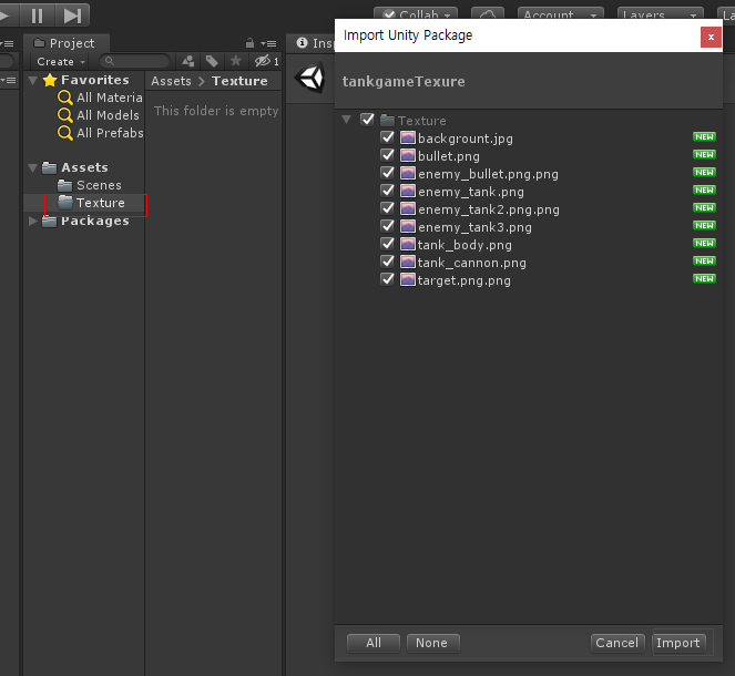 Texture파일을 만들고 Textrure 파일을 임포트 합니다 파일을 유니티로 끌어오거나 아니면 Texture 폴더를 선택하고 마우스 오른쪽 버튼을 누르고 import package -> Custorm Package를 선택하여 다운로드한 Textrure 파일을 선택하면 됩니다
