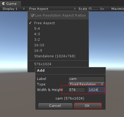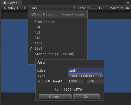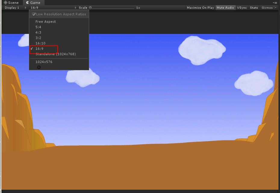 Game 화면을 아래 그림과 같이 Type ->Filxed Resolution 을 1024 476으로 맞춥니다