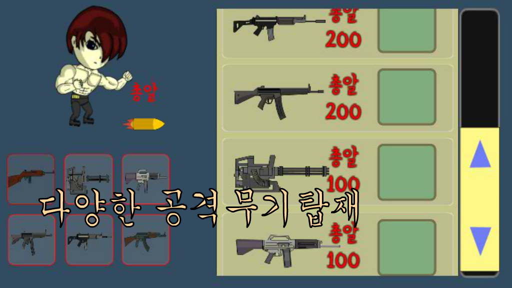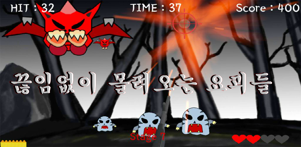 황금을 얻기 위해 음침하고 요괴들이 많이 출 물 하는 숲에서 요괴들을 사냥합니다 황금을 얻기 위해 많은 요괴를 잡아야 합니다 스테이지마다 60초 동안 요괴 사냥을 합니다 요괴를 많이 잡을수록 황금을 많이 얻습니다 요괴들을 사냥하지 못하고 요괴의 공격을 받으면 에너지가 줄어듭니다 스테이지가 올라 갈수록 요괴들이 많이 나옵니다 황금을 많이 얻으면 더욱 업그레이드된 사냥총을 구입할 수 있습니다