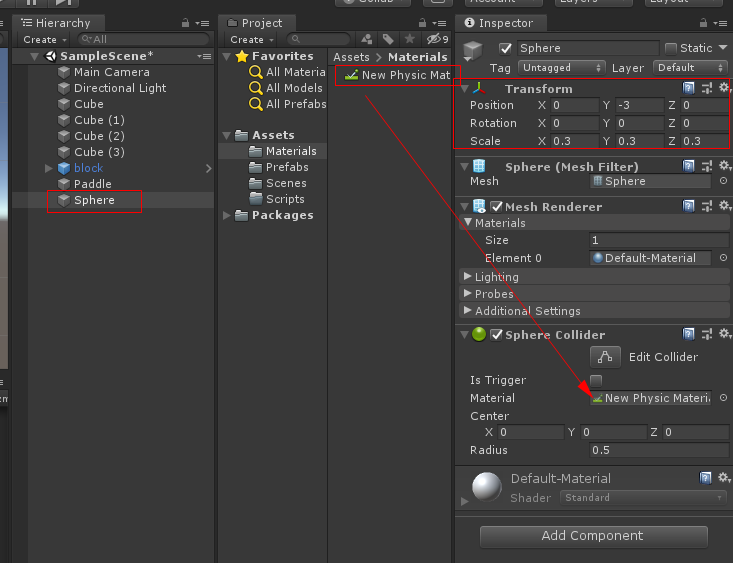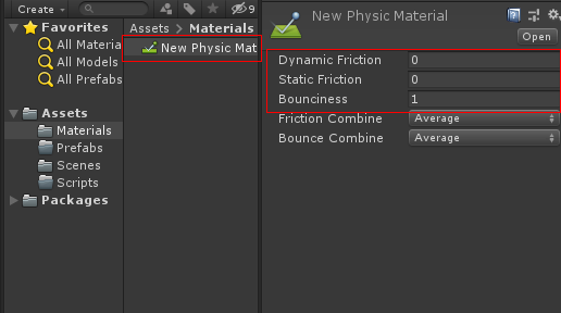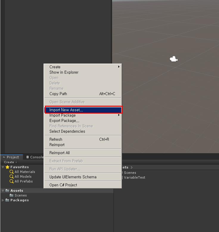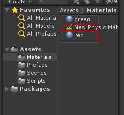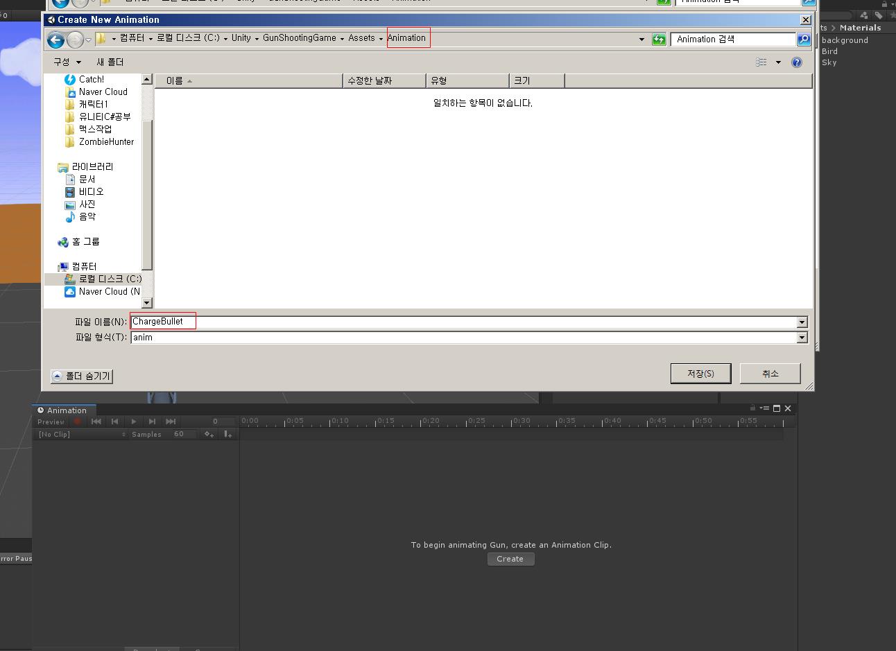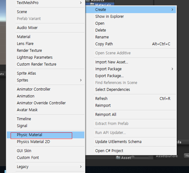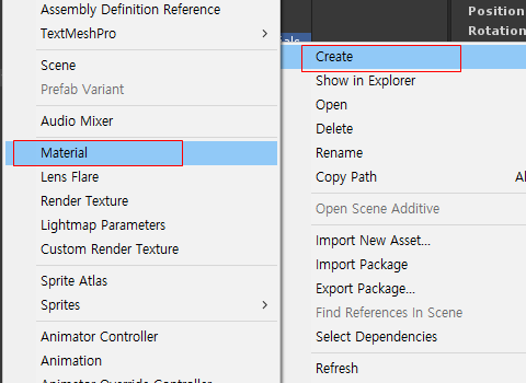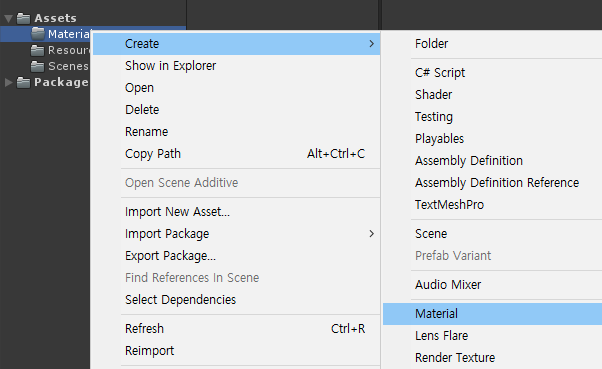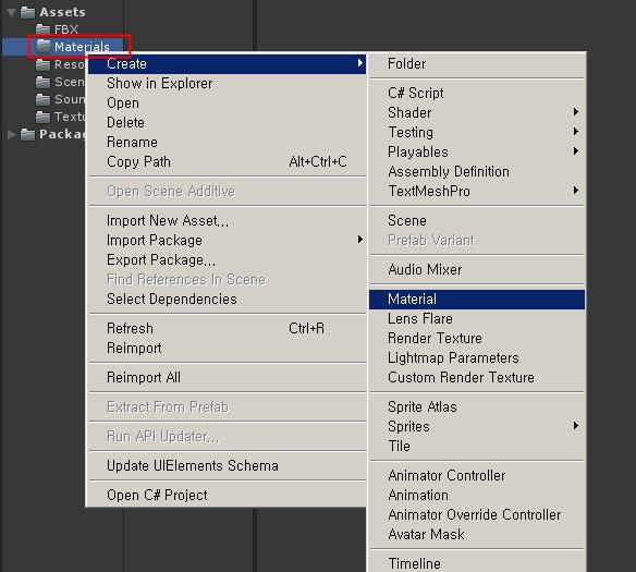 그리고 프로젝트 뷰에서 Materials 빈 파일을 만들고 마우스 오른쪽 버튼을 누르고 Material을 생성합니다