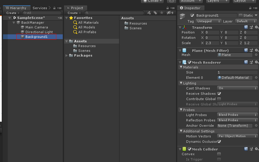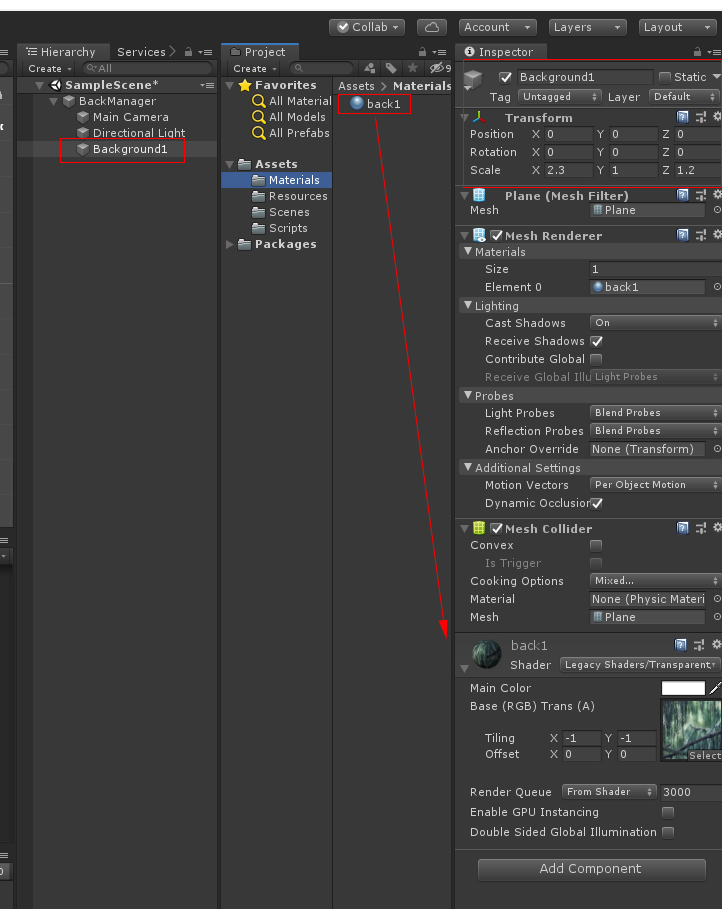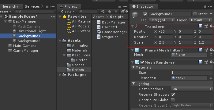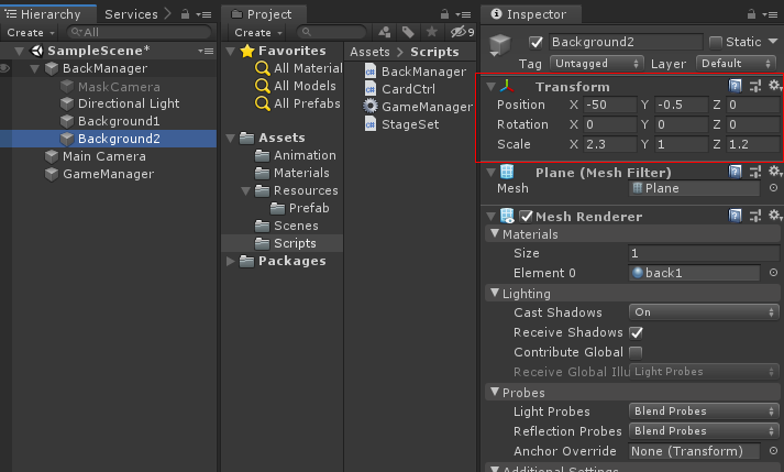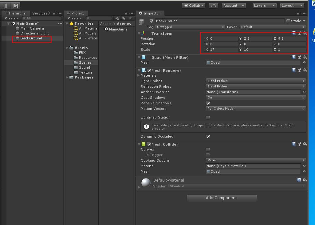 그리고 이름을 BackGround라고 바꾸고 Transform Position 값을 0, 2.3, 9.5 Scale 값을 17, 10 , 1로 바꿉니다