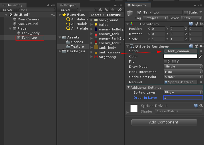Player 자식으로 Tank_top 오브젝트를 만들고 Sprite Renderer를 생성하여 tank_cannon을 넣고 SortingLayer -> Player