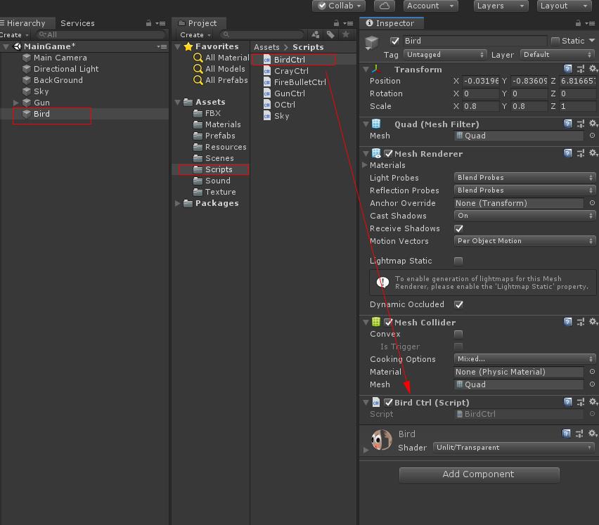 Scripts폴더에 BirdCtrl 스크립트를 만들고 BirdCtrl 스크립트를 작성합니다 그리고 Bird 오브젝트에 붙임니다