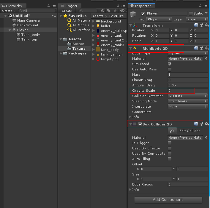 하이 라키 뷰에서 Player 오브젝트를 선택하고 Rigidbody2 D를 붙이고 Gravity Scale ->0으로 하고 Box Collider2D를 붙입니다