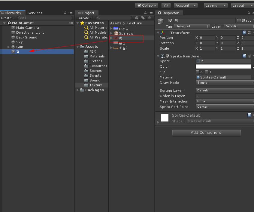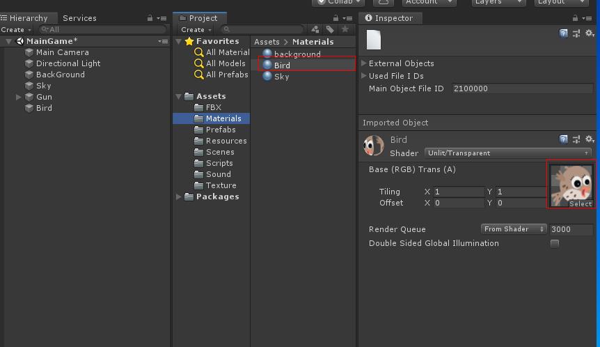 Materials 폴더에 메터리얼을 생성하고 이름을 Bird 라하고 Shader -> Unlit/Transfarent를 하고 Sparrow그림파일을 선택하여 나타나게 합니다