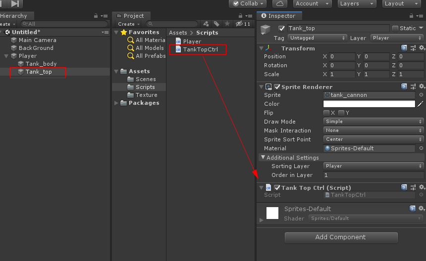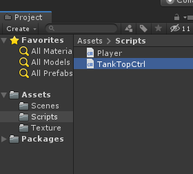 Player 자식으로 있는 Tank_top 오브젝트를 선택하고 TankTopCtrl 스크립트를 붙힘니다