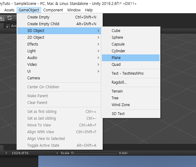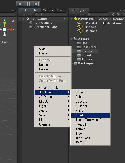 하이 라키 뷰에서 오른쪽 마우스 버튼을 누르고 Quad를 선택하여 생성합니다