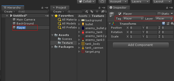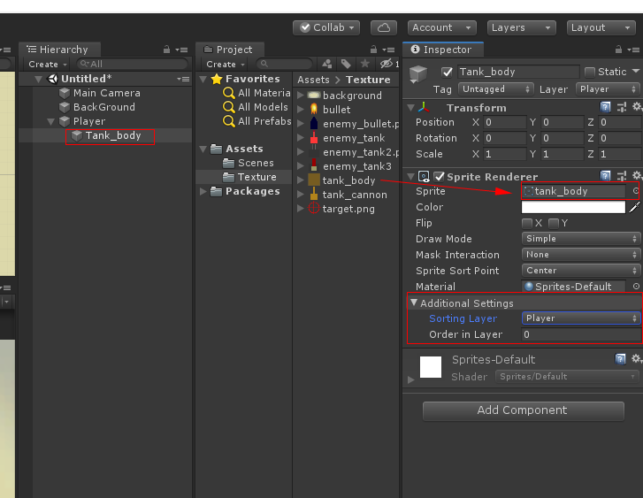 Player 오브젝트 자식으로 Tank_body 오브젝트를 만들고 그림 tank_body를 넣고 Sorting Layer를 Add Sorting Layer 를 누르고 Player 생성하고 Order in Layer 0으로 맞춥니다