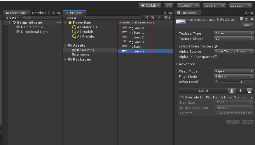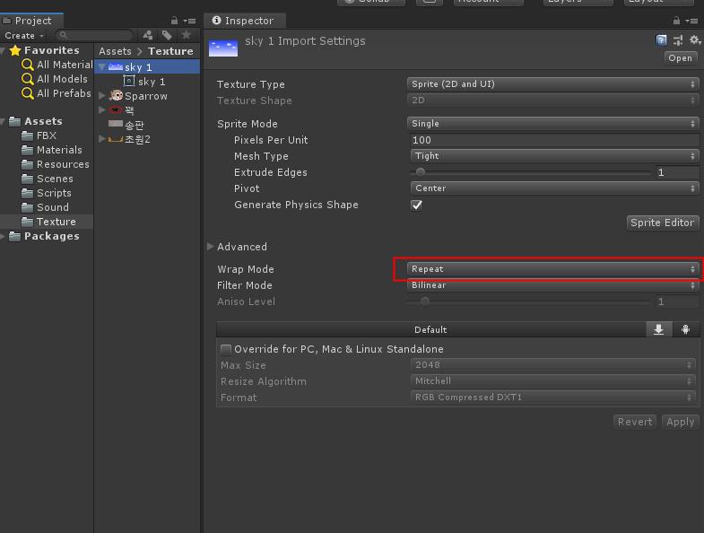 Texture 폴더의 sky1 그림파일에서 Wrap Mode -> Repeat로 바꿉니다