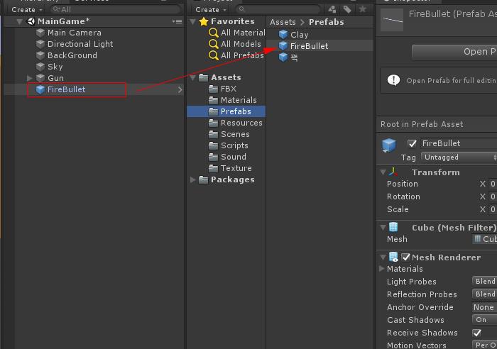 하이 라키 뷰에 FireBullet 오브젝트를 드래그 하여 Prefabs 폴더에 생성합니다