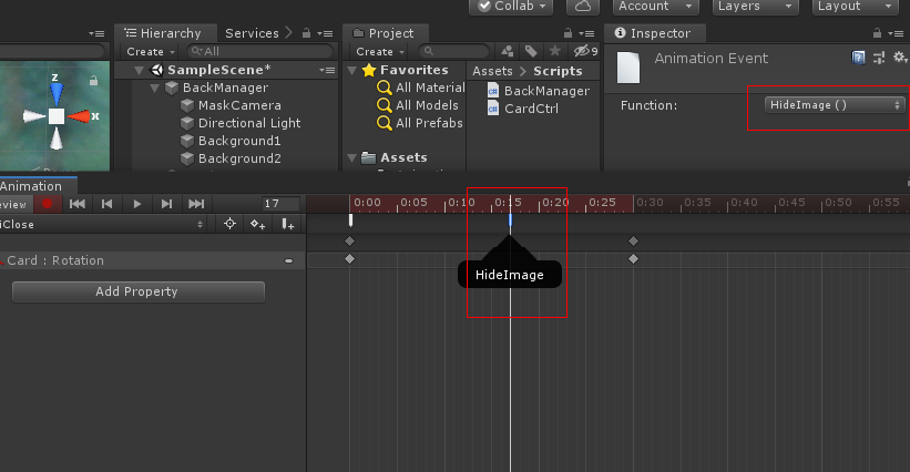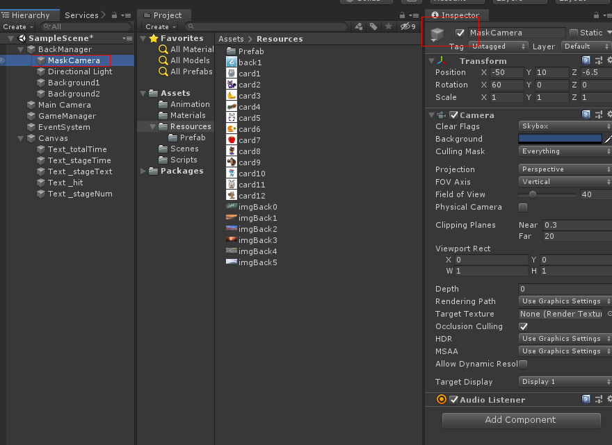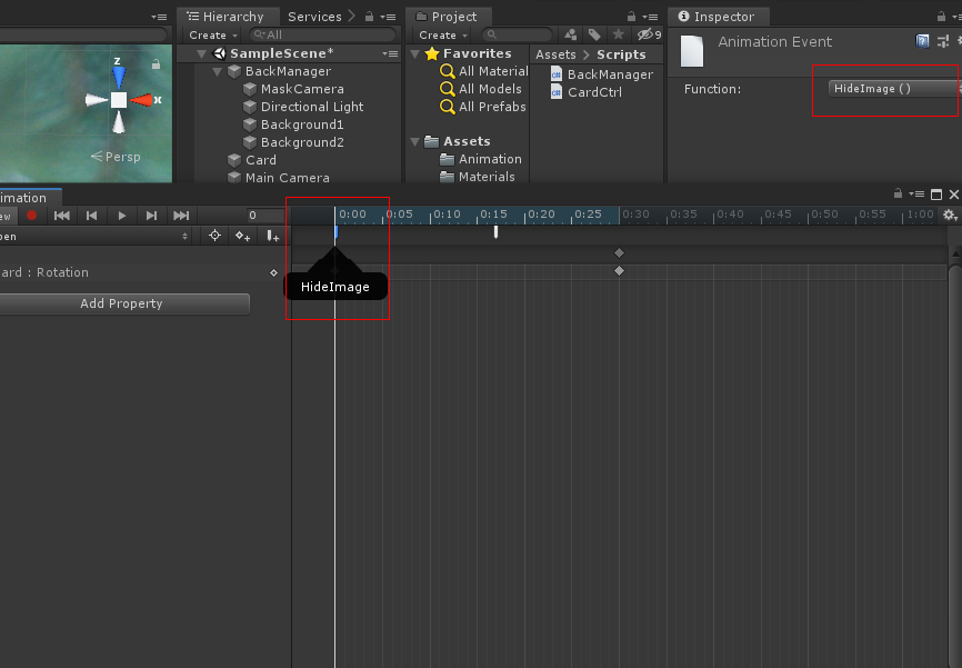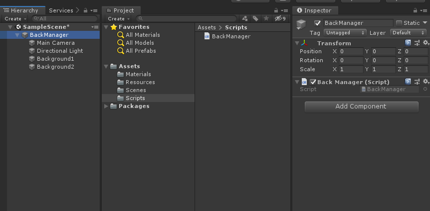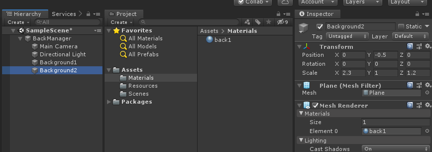 속성을 바꾼 메터리얼을 선택하여 하이 라키뷰의 BackGround 오브젝트를 선택하고 메터리얼을 드래그하여 붙혀 넣습니다
