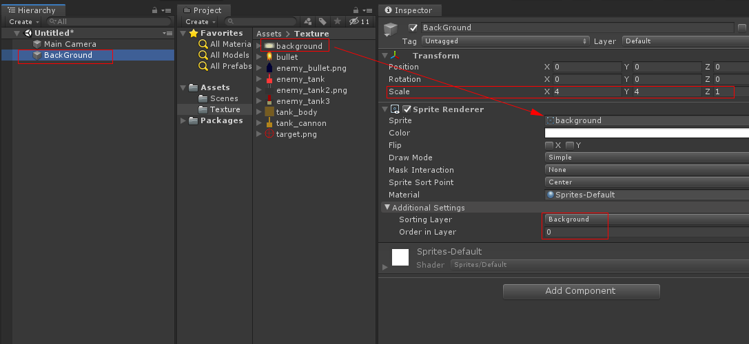하이 라키 뷰에서 BackGround 오브젝트를 만들고 Add Compnent를 선택하여 Sprite Renderer를 선택하고 그림 background를 넣고 SortingLayer를 Background를 생성하여 Order in Layer를 0으로 맞춥니다