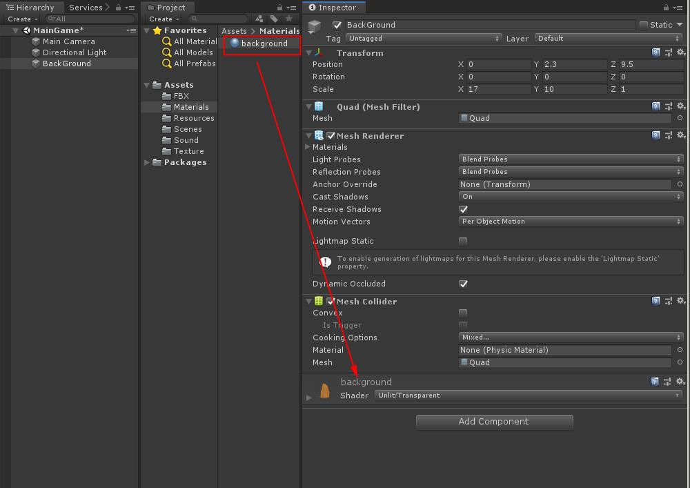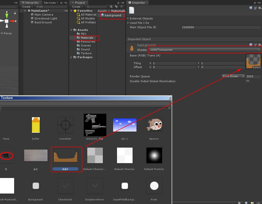 material의 이름을 background 라바꾸고 속성에 들어가서 Shader -> Unlit/Transparent로 바꾸고 그림 초원 2를 선택하여 넣습니다