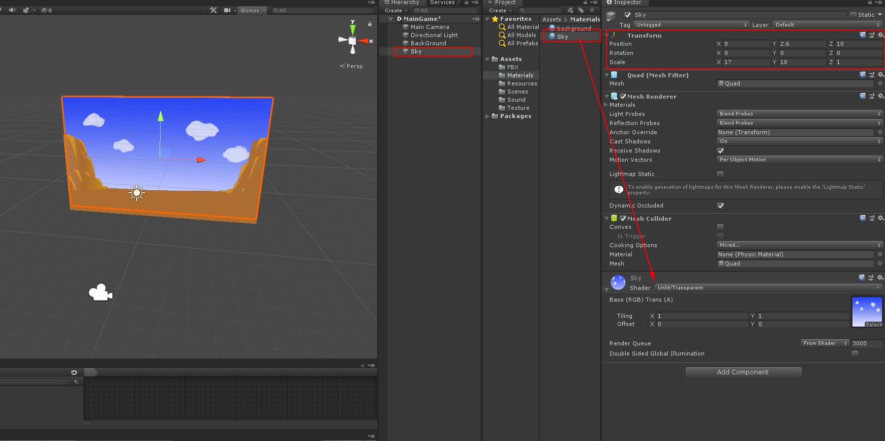 그리고 다시 하이라키 뷰의 Quad를 만들고 이름을 Sky 라 바꾼 다음 BackGround를 만든 것과 같이 Material를 생성하여 Shader를 Unlit/Transparent 토하고 그림을 sky1을 붙입니다 그리고 메터 리어를 Sky 오브젝트에 연결합니다