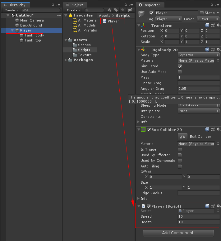 작성한 Player스크립트를 Player 오브젝트에 붙입니다