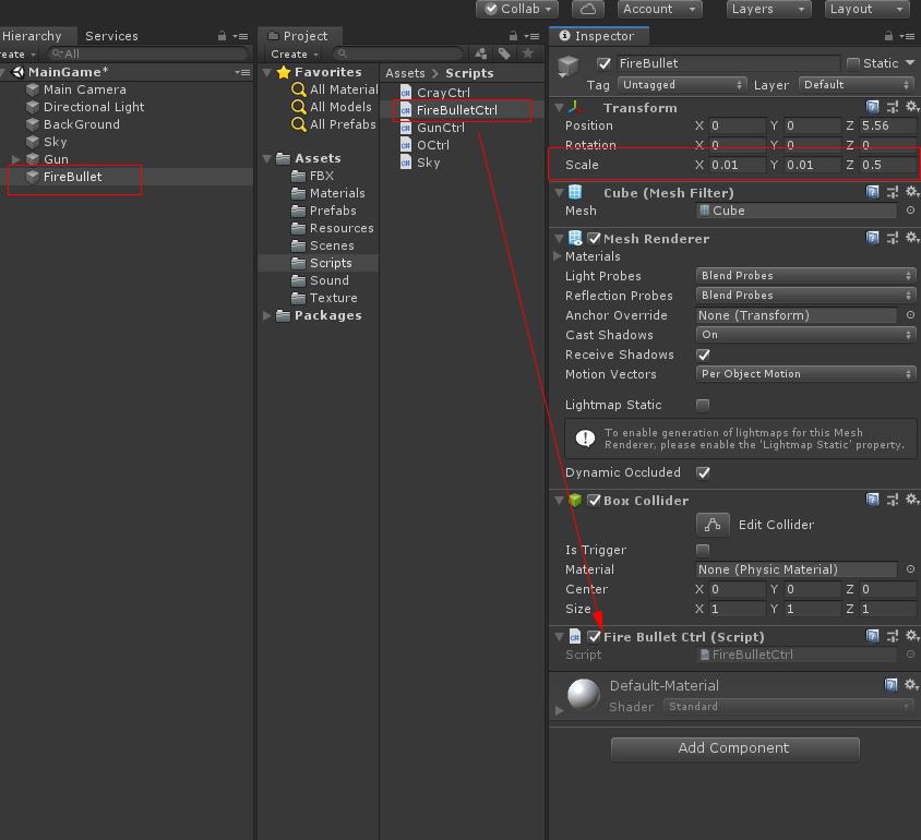 Cube의 이름을 FireBullet으로 바꾸고 FireBullet 스크립트를 생성하여 붙입니다