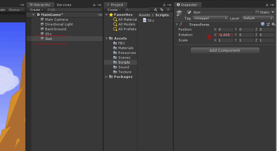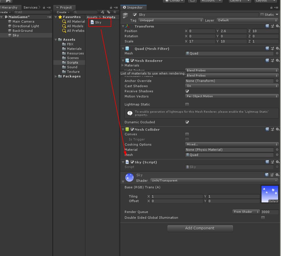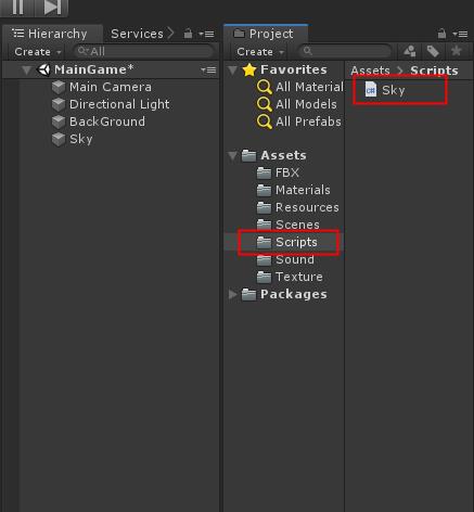 Scripts 폴더에서 Sky 스크립트를 생성하여 스크립트를 작성합니다